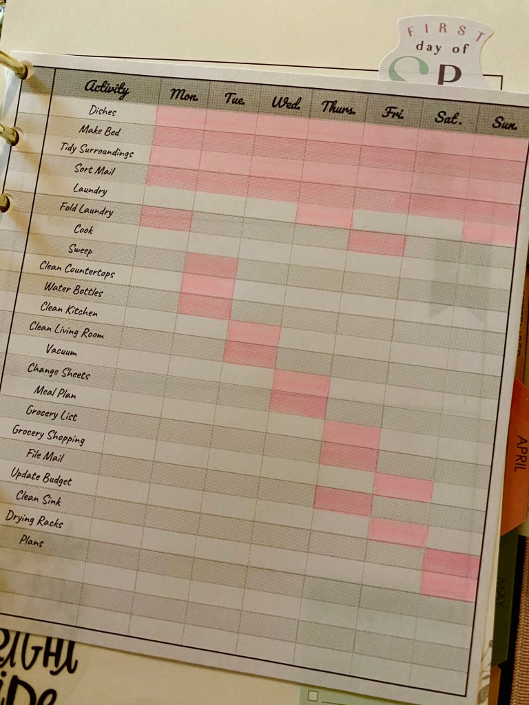 This kind of simple chart works really well for me, even when I don’t need the reminder to do certain chores that have become habits.